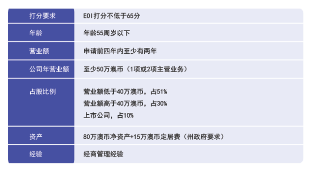 u 在公司中至少拥有30%股份,且公司年营业额不少于50万澳元(如单一公司年营业额不到50万澳元,可以最多使用2家公司营业额相加。如公司年营业额不到40万澳元,必须占股51%。如超过40万澳元以上,占股30%。